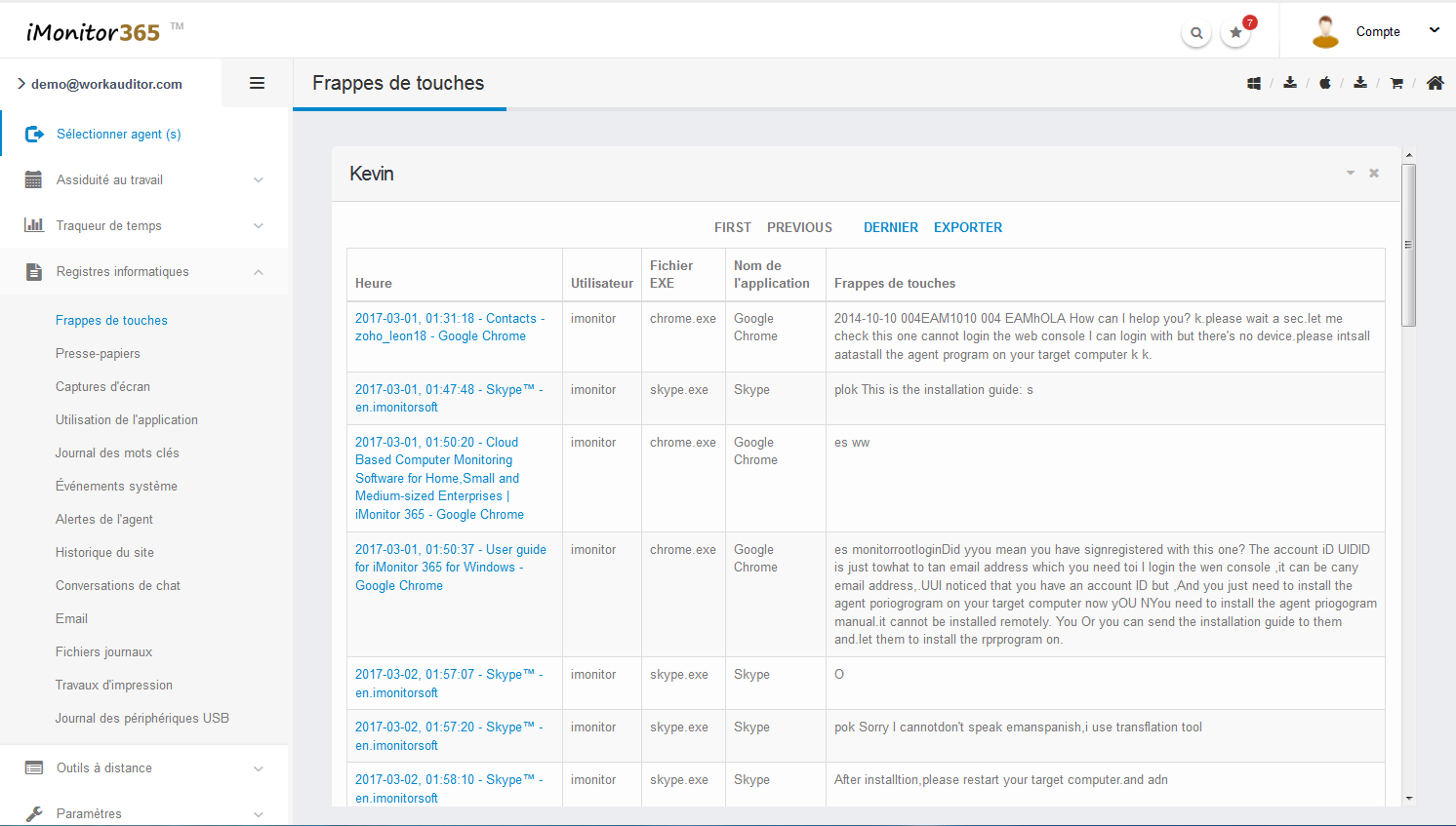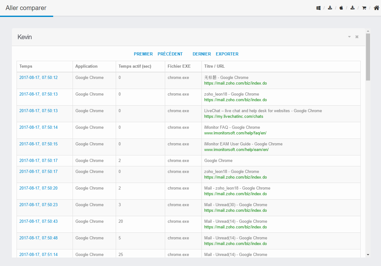 Enregistrer les journaux des activités informatiques et Internet de l'employé est disponible avec iMonitor 365 et enregistré sur le nuage 7 à 30 jours. L'utilisateur peut afficher les rapports en ligne ou télécharger les fichiers XLSX sur le disque local.